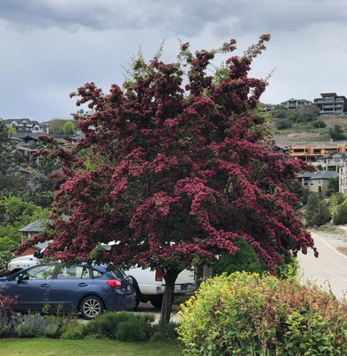 | Thornless. Shiny green foliage. Stunning flower display in May from 2" clusters of dark pink flowers. Flowers are somewhat malodorous. May get infected with fire blight. Glossy red berries. Bronze/red fall colour. Good for small yard. Adapts to most soils as long as they're well drained. |