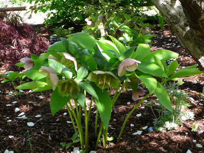 | Cut old leaves off in spring. Excellent dry shade plant under trees. Place so you can see its early bloom from the house. Long lasting cut flowers. Excellent heat resistance, moderate growth rate. Glossy Foliage |