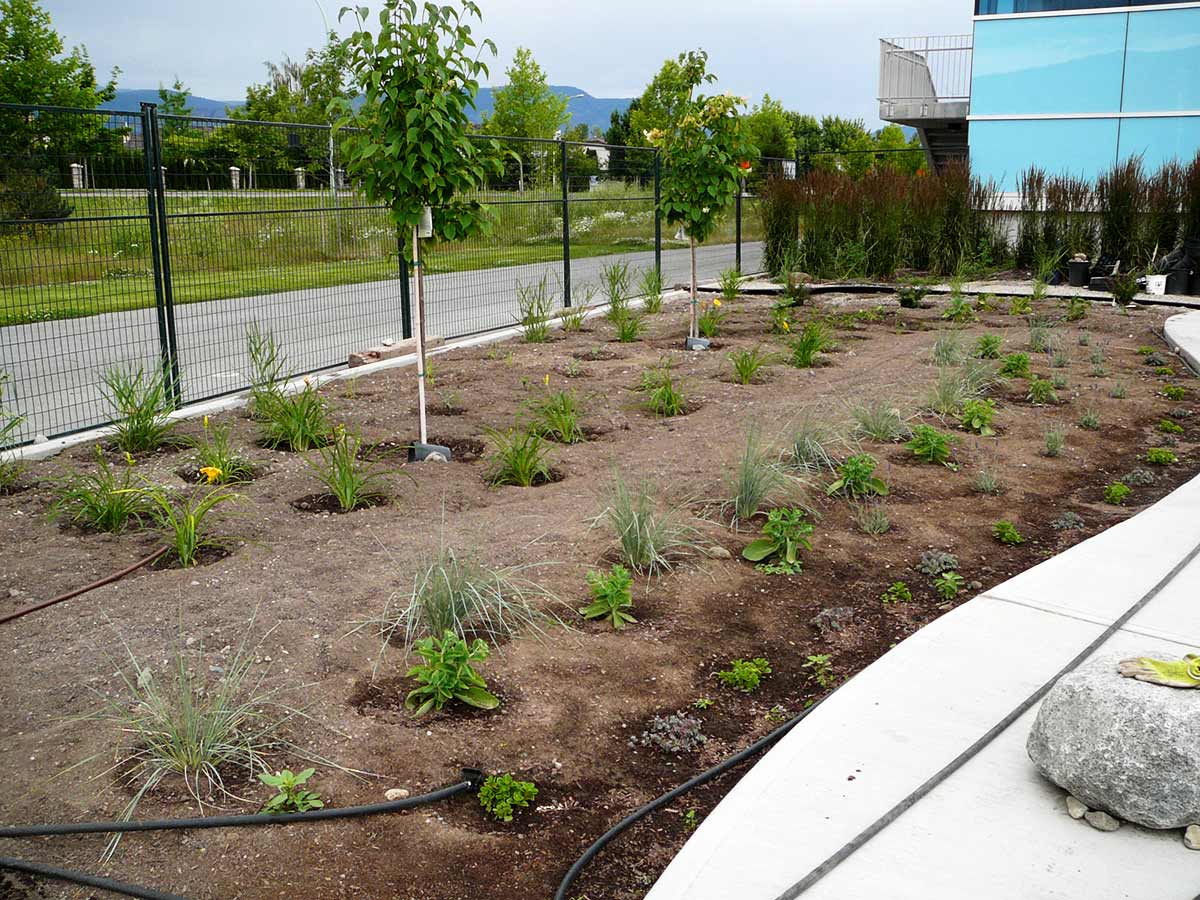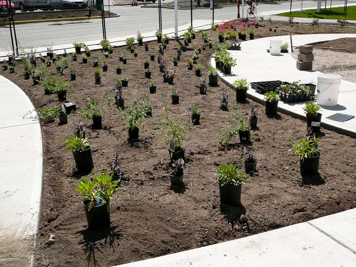 The soil on the site was excavation fill; full of concrete waste, gravel, rocks and hard-packed earth. In April 2010 this was removed to a depth of approximately one foot. Good garden soil was then brought in to fill planting areas and crush was brought in for the remaining pathways.